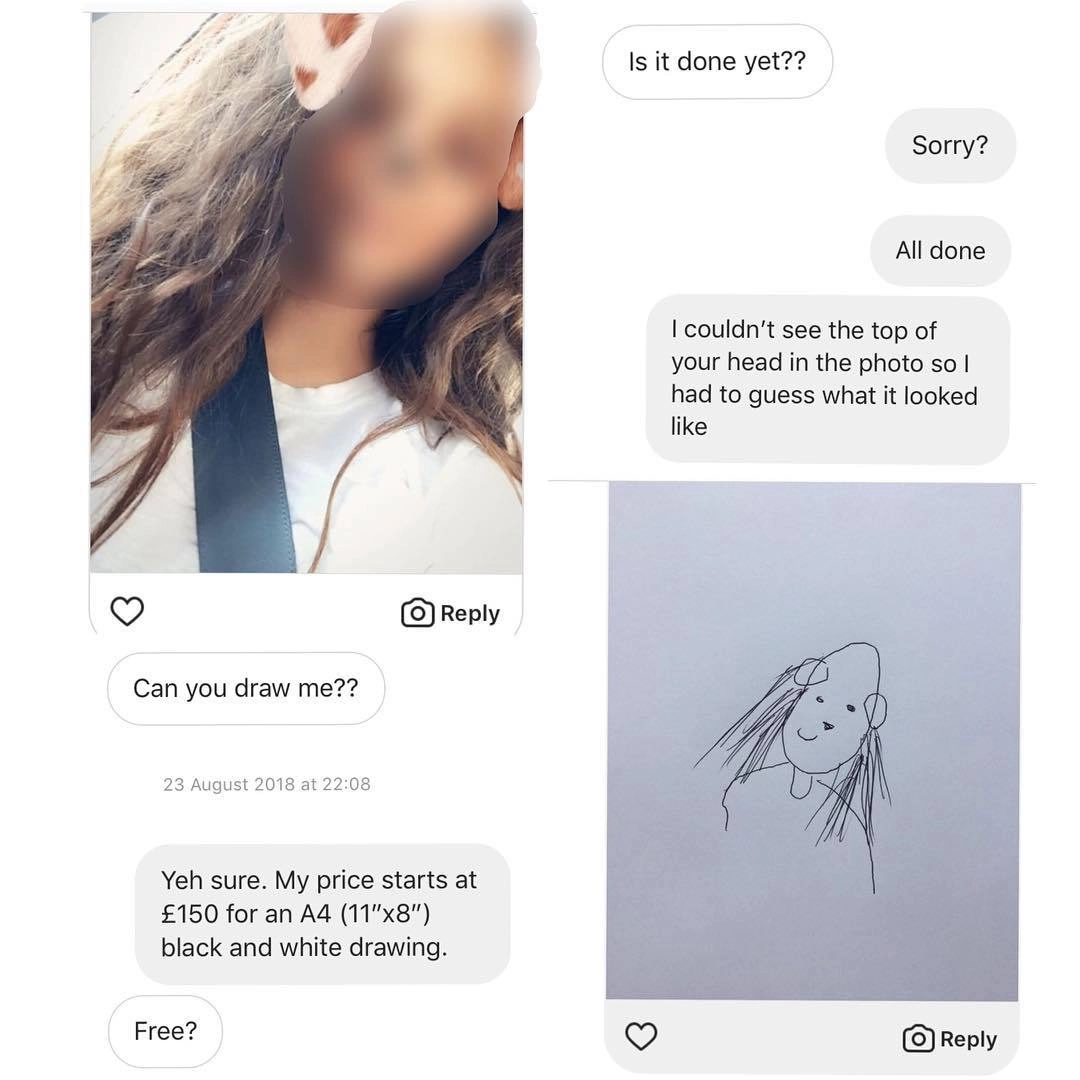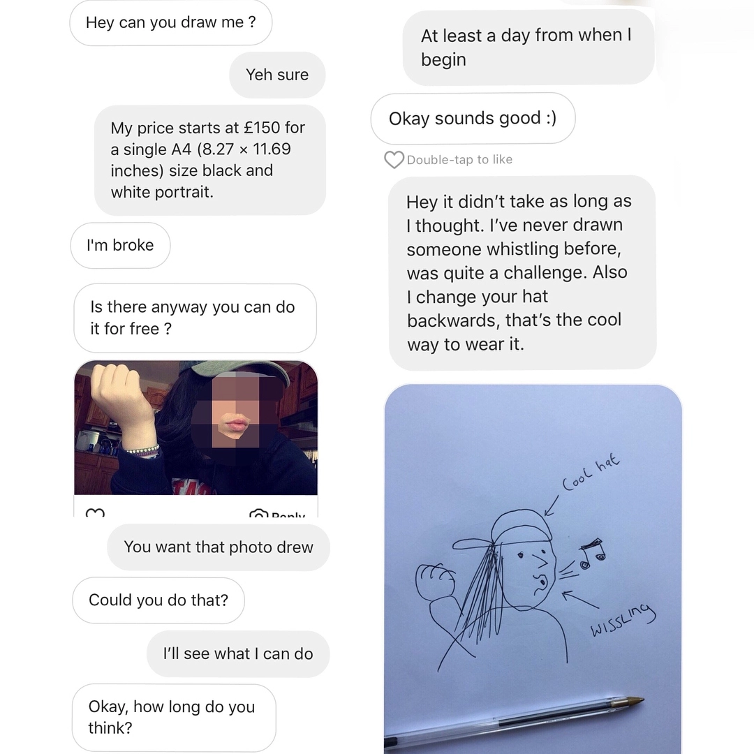 — Вы можете нарисовать меня?— Да, конечно. Цена начинается от 150 фунтов за чёрно-белый рисунок размером А4.