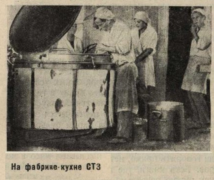 На СТЗ я попал в 1931 году. На фабрике-кухне были еще леса. Не было подъемника, не все машины работали, электропроводка не была еще закончена. Все было сделано на живую нитку. Каждый день не было то света, то воды. Все-таки мы открыли фабрику-кухню прекрасным обедом. Было пять горячих блюд и восемь закусок. Пригласили мы на этот обед двести лучших рабочих со всех цехов. В числе холодных закусок мы дали: балык, салат-помидор, оливьен, канапэ, белую булку, прожаренную полосками с лососиной и паюсной икрой, а посредине — провансаль и зеленый лук.