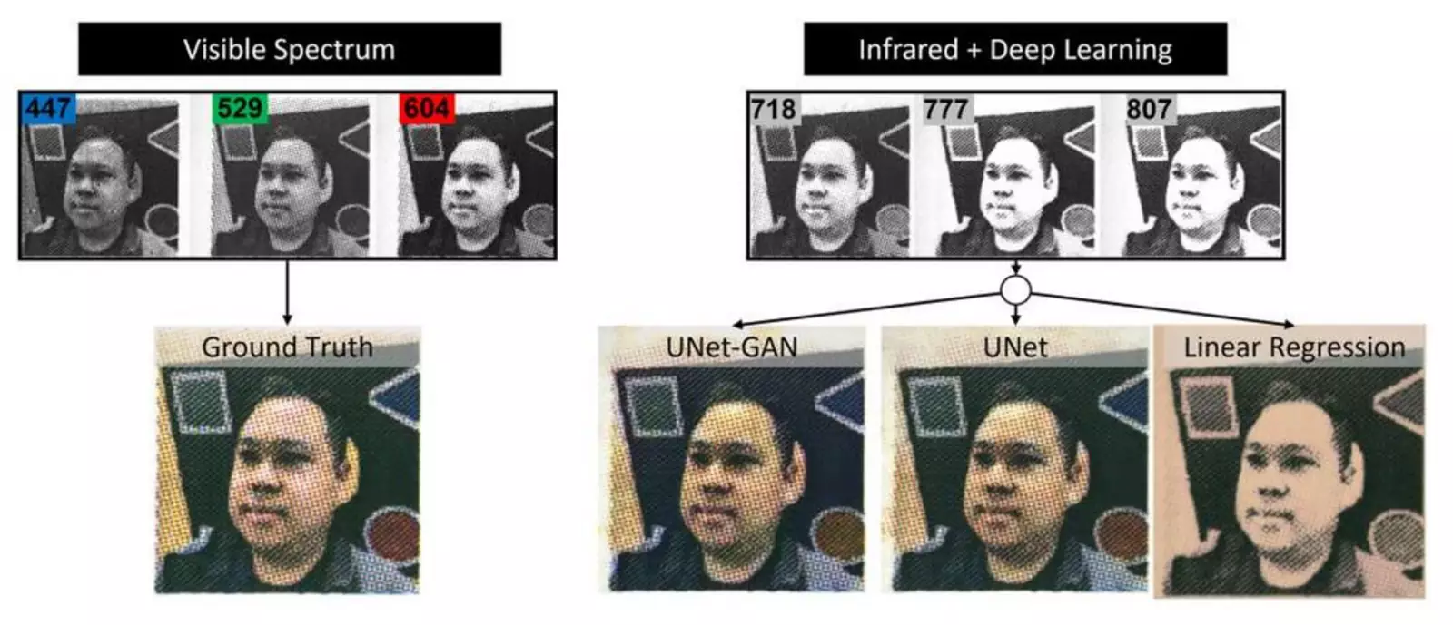 Поэтому ученые стремились разработать алгоритм визуализации, основанный на искусственном интеллекте, с помощью которого можно отрендерить инфракрасное спектральное освещение сцены и сделать его цветным. Иными словами, изображение, сделанное буквально в полной темноте, можно проявить и сделать его видимым для человека.