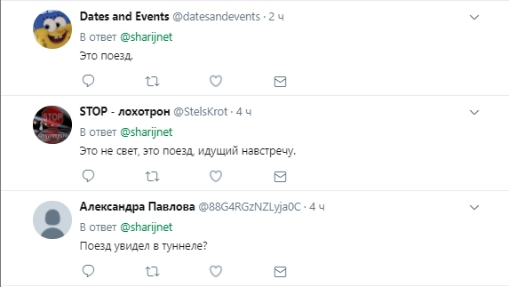 «Это белочка с фонарем», «Так много он еще не пил», «Вообще-то считается, что свет в конце тоннеля видят души, которые отделяются от тела», — рассуждают комментаторы. «Это ж в какой тоннель он смотрел?» — недоумевают другие.