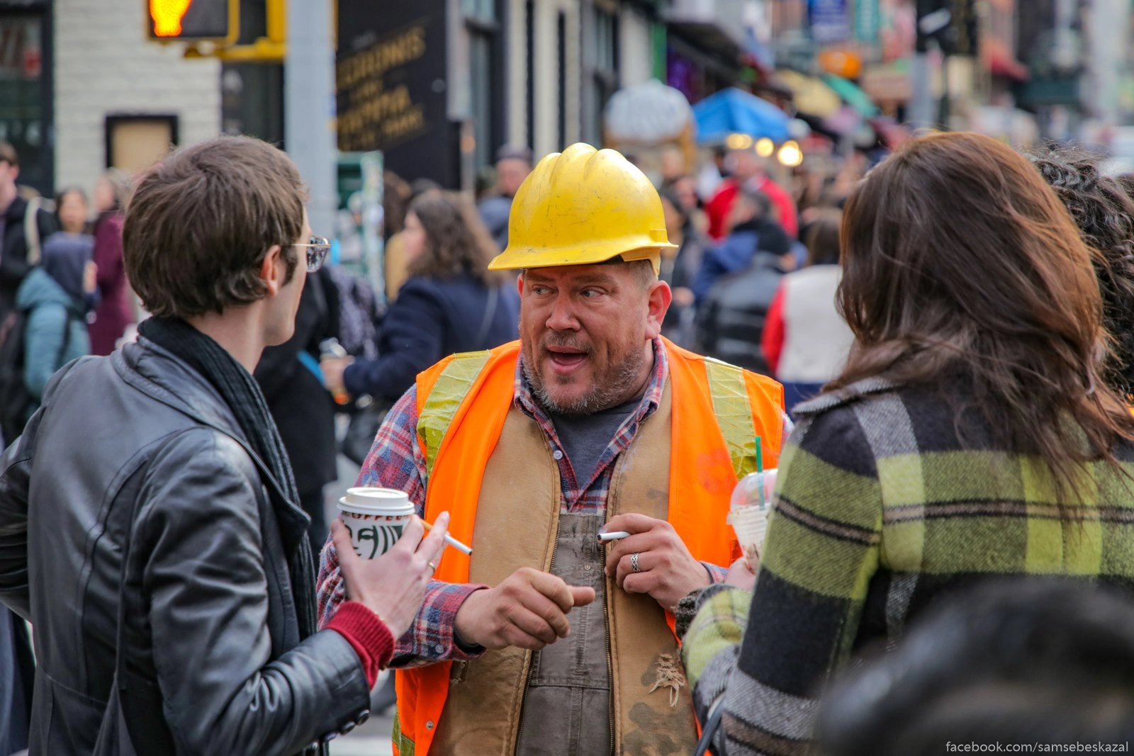Актеры из массовки. Типа прохожие обсуждают последние новости. Мужик в каске потом подошел ко мне и спросил глядя на мой DJI Osmo, что это такое? Я ответил, что камера и он в ответ сыграл так, будто на дворе 1975 год, а я сумасшедший выдающий маленький кусок пластика за что-то снимающее видео :)