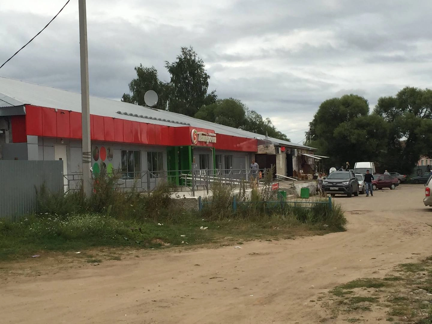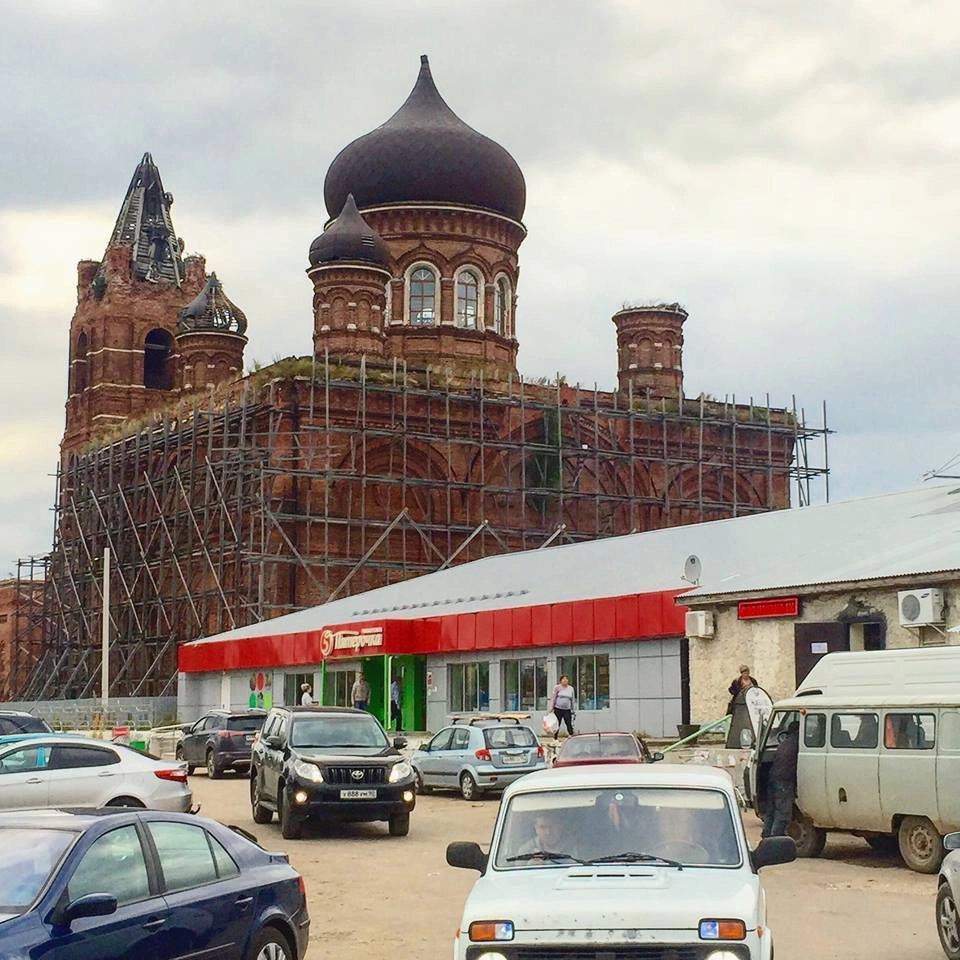 Необычна и окружающая собор площадь. Его окружает два магазина — Пятерочка и Дикси, павильоны по разливу живого пива и офис по продаже шатурской мебели.