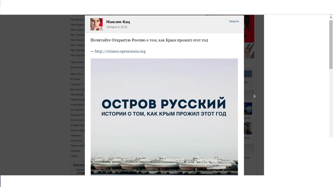 Дабы доказать собственную правоту, Максим Кац на своей страничке Вконтакте опубликовал ссылку на интернет-ресурс движения «Открытая Россия», созданного беглым олигархом Михаилом Ходорковским, который, как известно, в последнее время очень удачно переквалифицировался в профессионального революционера.