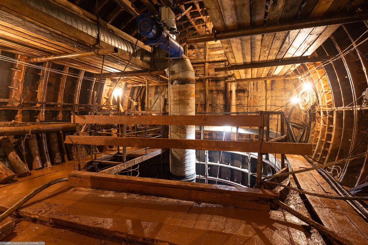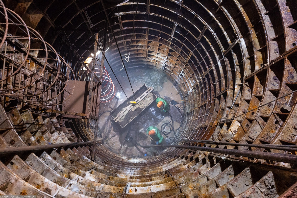 Потом спустимся на глубину 70 метров, где ведется разработка руддвора шахты для строительства станции «Шереметьевская». Из этой шахты будут сооружены левые и правые станционные тоннели. Но после того, как с помощью ТПМК будут пройдены их пилот-тоннели.