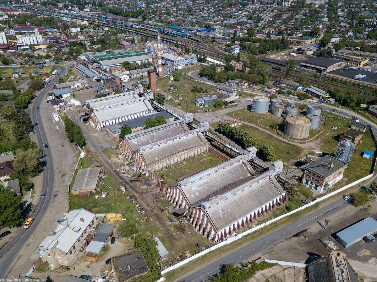 Характерное здание этого завода — склады сырья. За ними — вагоноопрокидыватель.