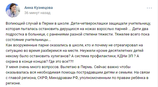 Уполномоченный по правам ребенка при президенте РФ Анна Кузнецова сообщила, что вылетает на место ЧП, и пообещала разобраться, как в школе оказались вооруженные люди.