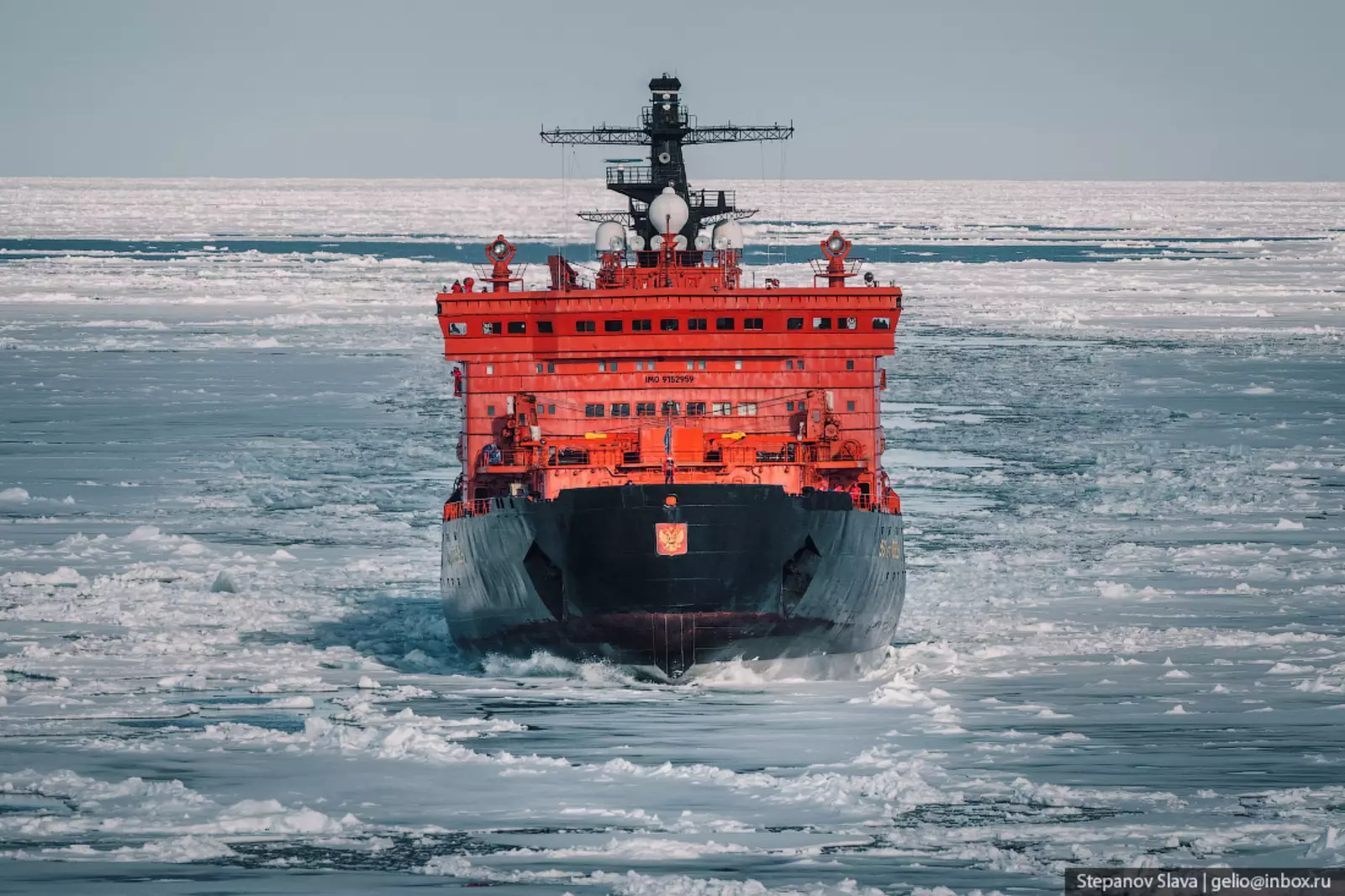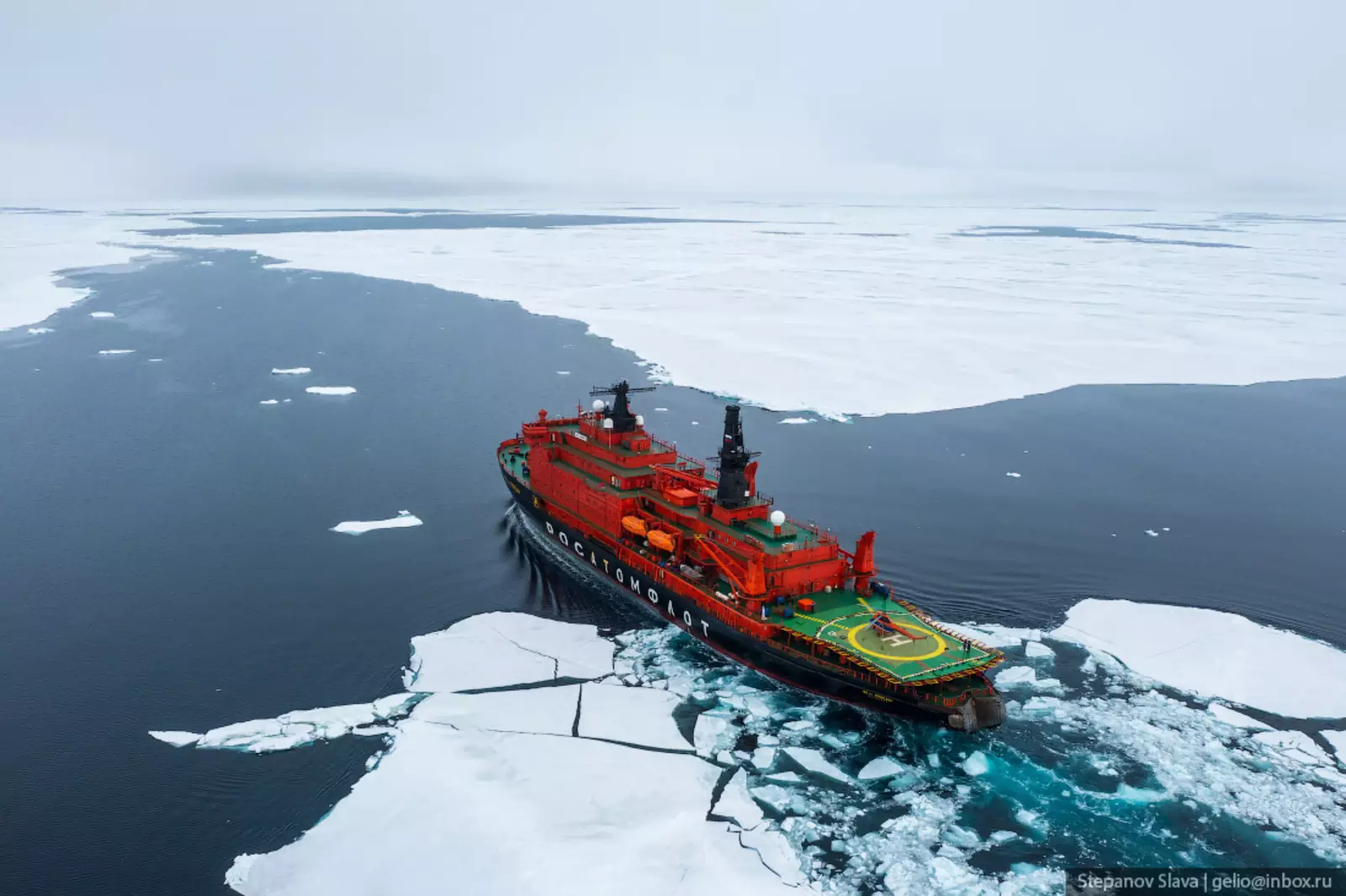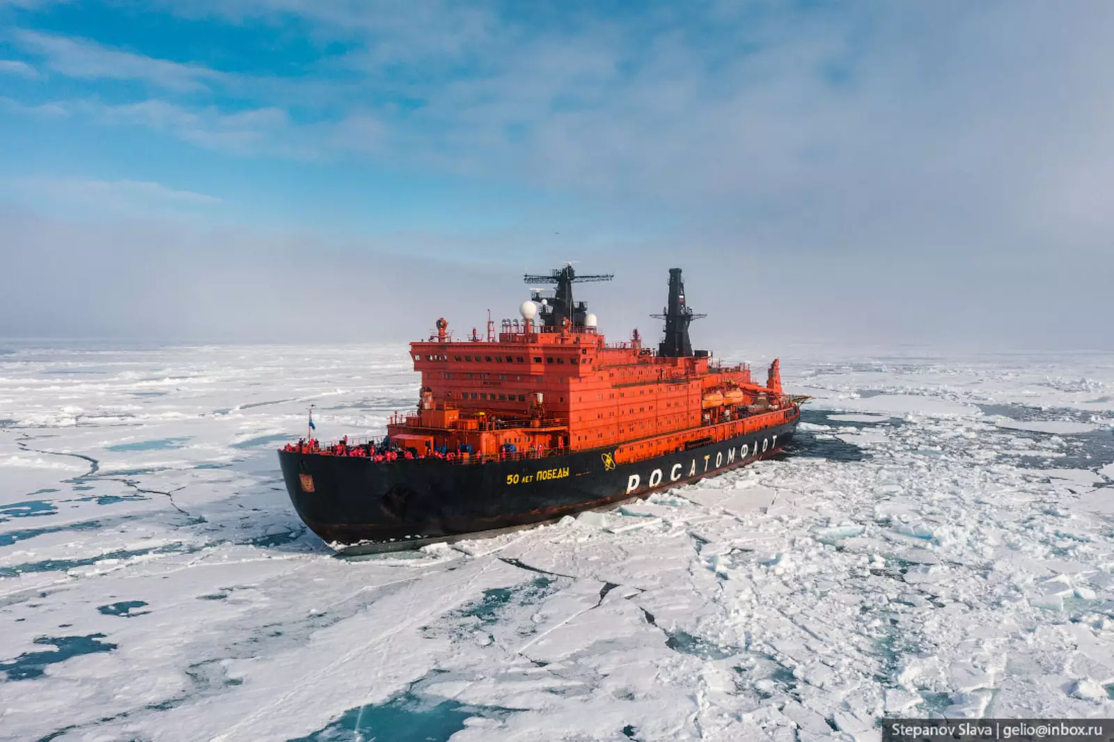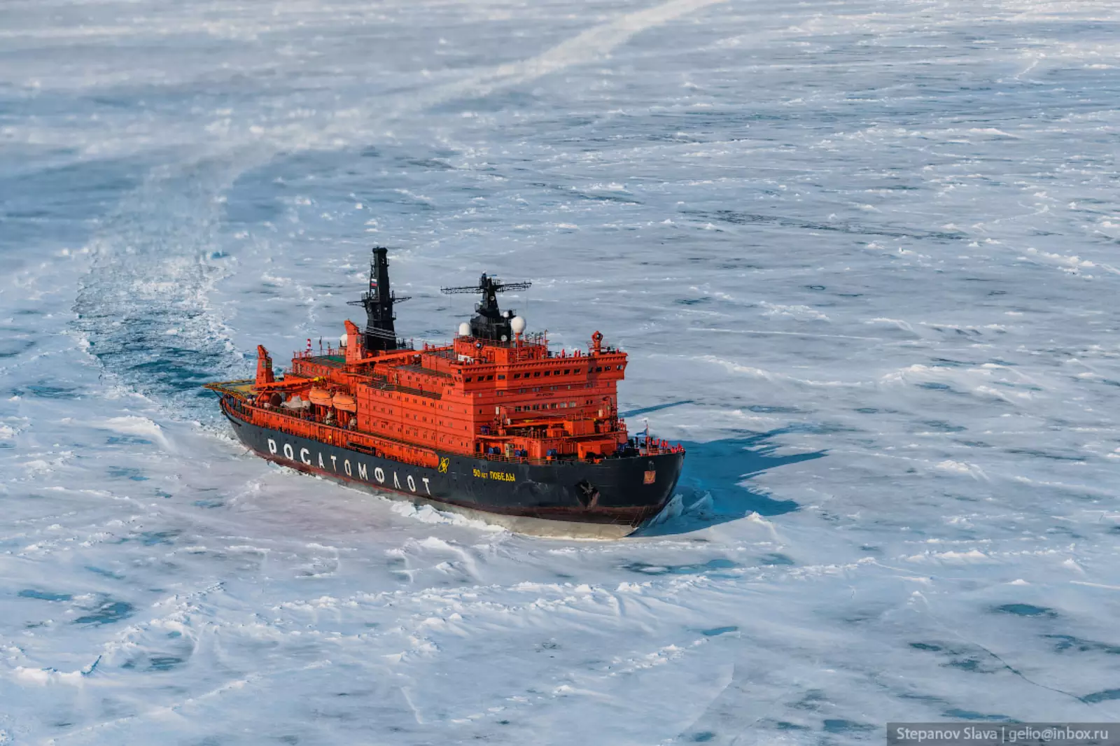 11. По чистой воде атомоход «50 лет Победы» идет со скоростью до 21 узла (38 км/ч), но льды замедляют движение. Покров толщиной 2,8 м ледокол проходит на скорости до 3 узлов (5−6 км/ч). В 2014 году именно этот ледоход доставил во время полярной ночи Олимпийский огонь на «вершину мира», а в 2017 году поставил рекорд — добрался от Мурманска до Северного полюса за 79 часов. Средняя скорость такого рейса получается около 16 узлов (30 км/ч).