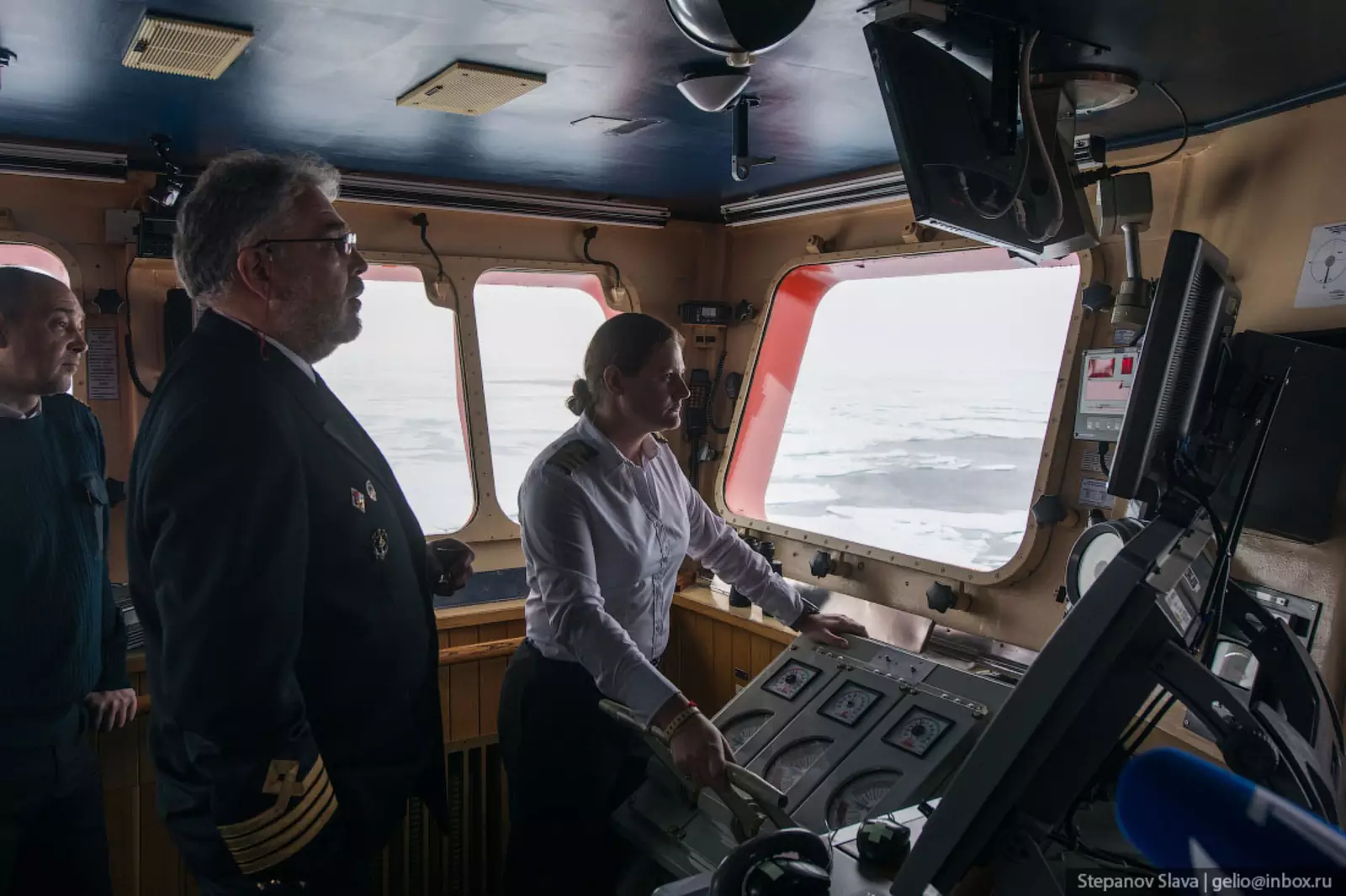 16. Капитан Дмитрий Лобусов и старший помощник Диана Киджи следят за приборами и корректируют курс. Им ещё нужно рассчитать остановку точно на Северном полюсе с учётом текущей ледовой обстановки.