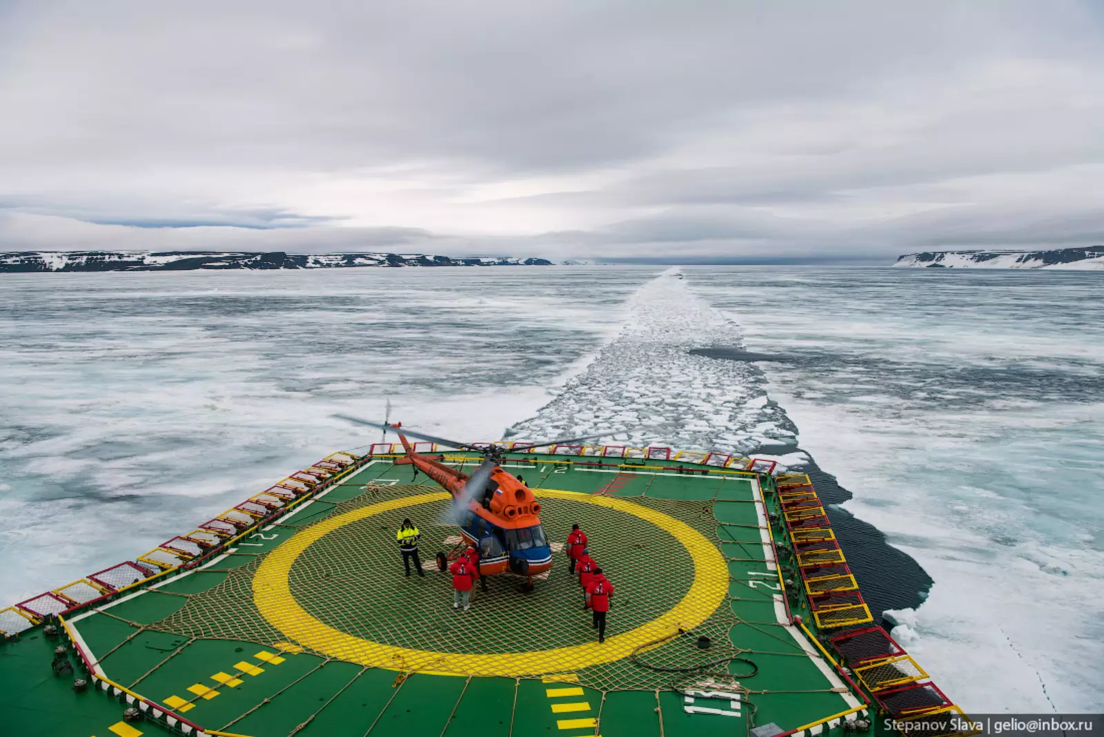 62. Вертолётная площадка расположена на корме атомохода. Во время штатной работы ледокола вертолёт используют для ледовой разведки, подвозят на судно детали, доставляют припасы экспедициям на льдинах, высаживаются в труднодоступных местах.