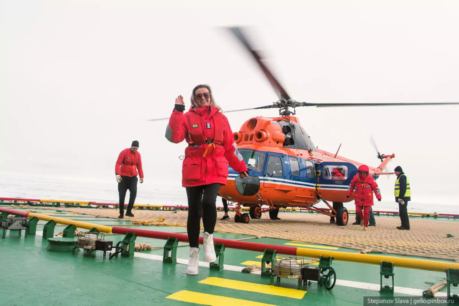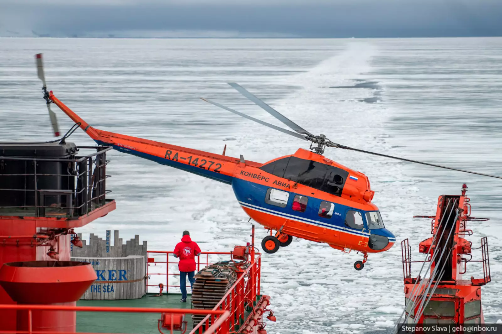 57. Обязательная часть программы экспедиции — полёты на вертолёте. Если позволяет погода, участники летают над арктикой по пути на Северный полюс и обратно, во время движения и стоянок, для осмотра островов Земли Франца-Иосифа.