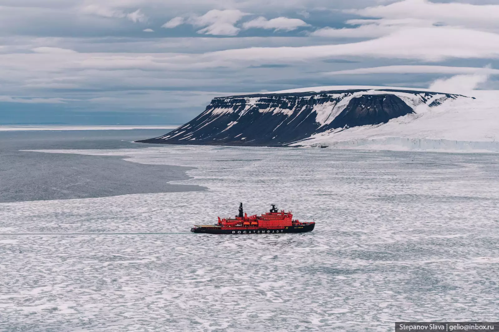 55. На обратном пути ледокол проходит через архипелаг Земля Франца-Иосифа, самый северный в Евразии. В его состав входит остров Рудольфа, на котором находится мыс Флигели — самая северная точка суши перед полюсом.
