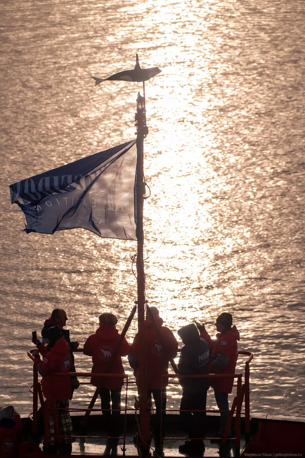 38. Члены экспедиции неспешно прогуливаются вокруг ледокола, расходятся в разные стороны, фотографируются. Суммарно стоянка на полюсе продолжается почти сутки — можно успеть испытать всё, что приготовили организаторы и разрешает экспедиционный лидер.
