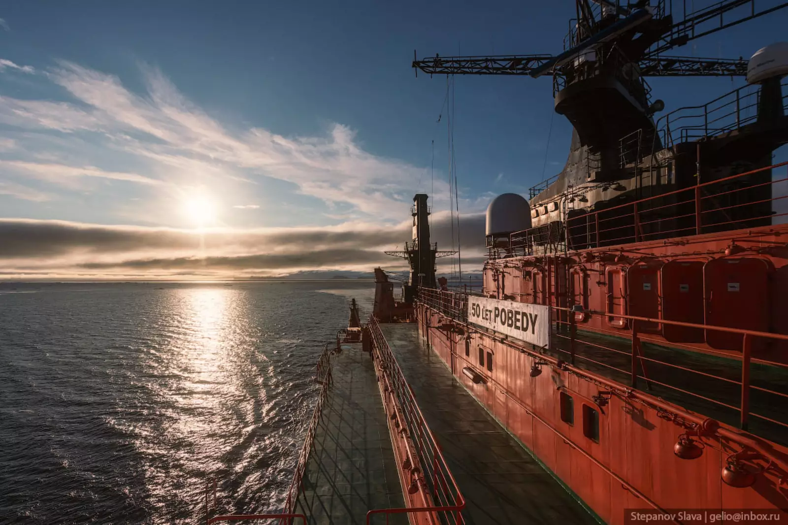 7. Туристы любят проводить время на баке — передней части палубы ледокола. Вокруг — бескрайнее и спокойный Северный Ледовитый океан. Летом здесь полярный день — солнце светит круглосуточно. В свободное время пассажиры ходят на лекции и экскурсии по ледоколу. Эксперты рассказывают об истории Северного флота, показывают машинное отделение.