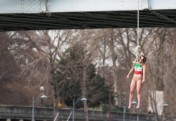 Активистка Сара Константин висит на веревке, имитирующей удушающую петлю, на парижском мосту, чтобы привлечь внимание к большому количеству казней в Иране. Париж, 28 января 2016 года.
