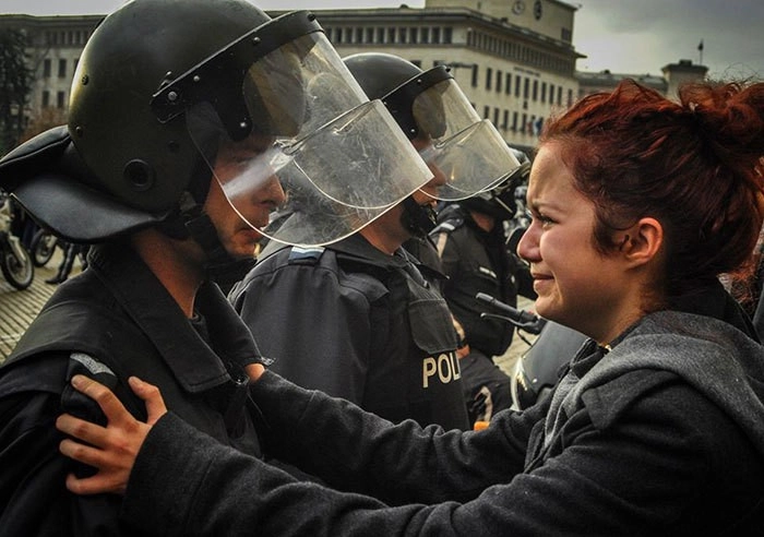 Девушка умоляет офицеров полиции не использовать силу против протестующих. Болгария, ноябрь 2013 год.