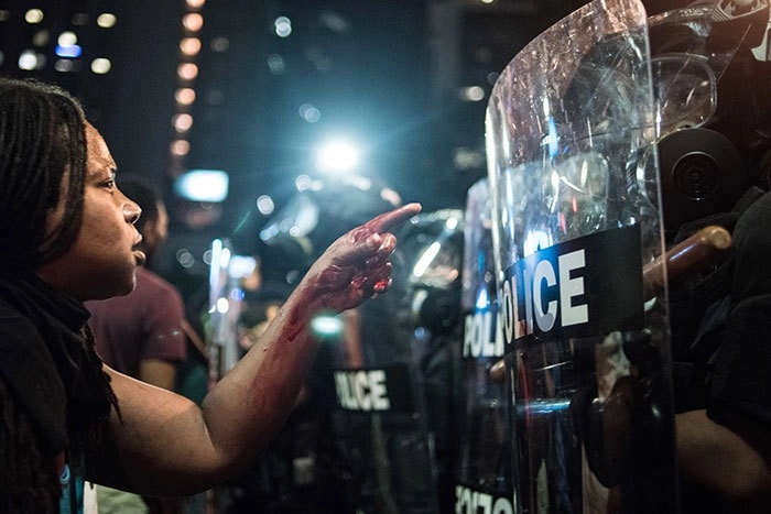 Женщина с окровавленной рукой указывает на полицейского в Шарлотте, штат Северная Каролина, 21 сентября 2016 года.