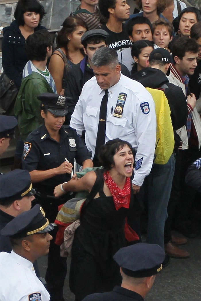 Полиция арестовывает демонстрантку на Уолл-стрит, после того, как она и другие участники протеста попытались пересечь Бруклинский мост по автомагистрали. Вместе с ней были арестованы сотни протестующих, Нью-Йорк, 1 октября 2011 года.