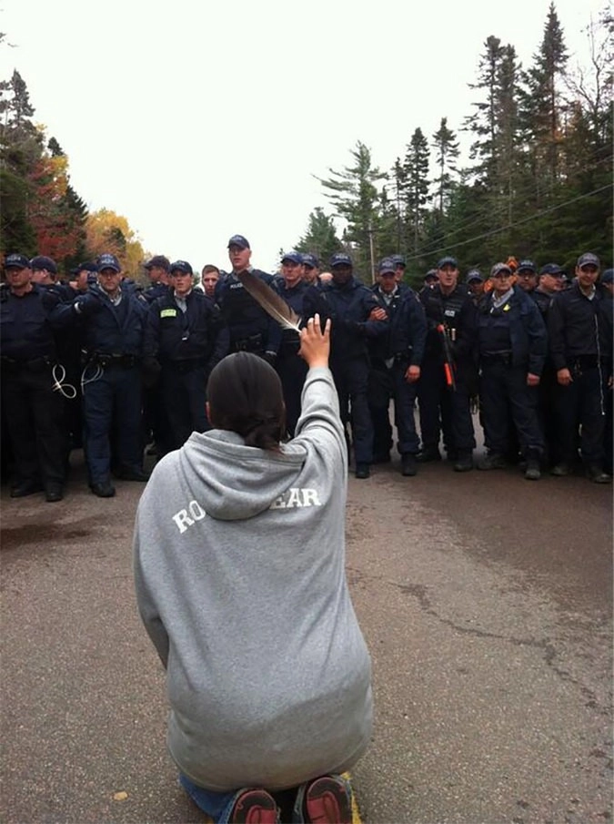 Женщина стоит на коленях и держит перо, чтобы сдержать полицейских, собирающихся разгонять протестующих в Нью-Брансуике, Канада, октябрь 2013 года.