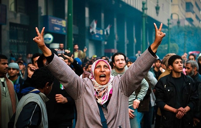 Женщина поднимает руки в жесте «победа» во время столкновений с военной полицией около площади Тахрир, Каир, 17 января 2013 года.