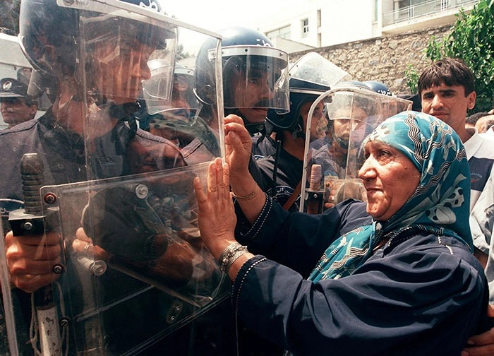 Женщина пытается жестами остановить полицейских во время митинга за культуру и демократию (Rcd), Алжир, 02 июля.
