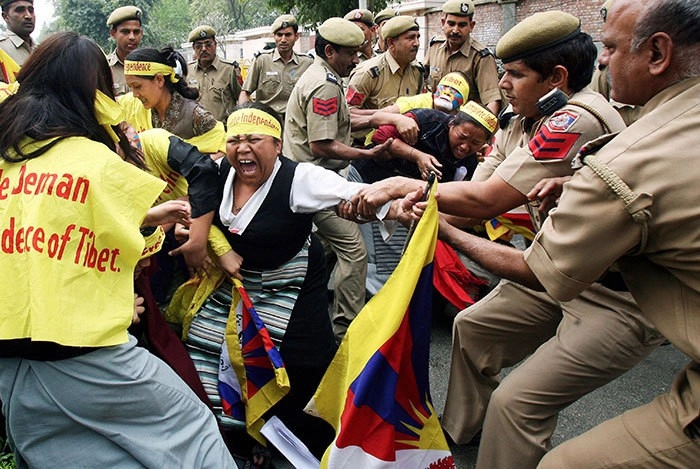 Полиция Индии сдерживает тибетскую женщину во время демонстрации в посольстве Китая в связи с восстанием тибетских женщин, Нью-Дели, 12 марта 2008 года.