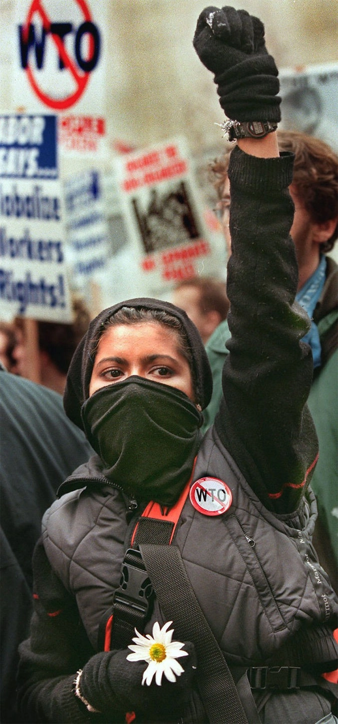 Демонстрантка держит цветок, который, по её словам, является символом надежды, 3 декабря 1999 года.