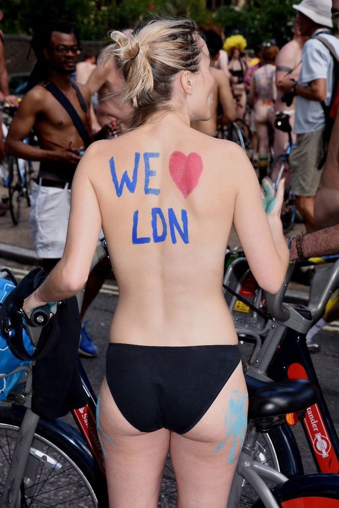 Голая велосипедистка участвует в велопробеге против засилья автомобилей, Лондон, Великобритания, июнь 2017 года.
