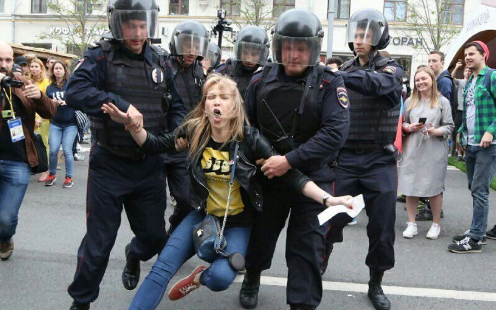 Девушку задерживает полиция на митинге сторонников Навального в День России, 12 июня 2017 года.