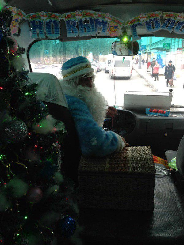 Уже второй год подряд водитель маршрутки № 21 в Новороссийске устанавливает в машине новогоднюю ёлку, вешает гирлянды и украшения, и накрывает праздничный стол.