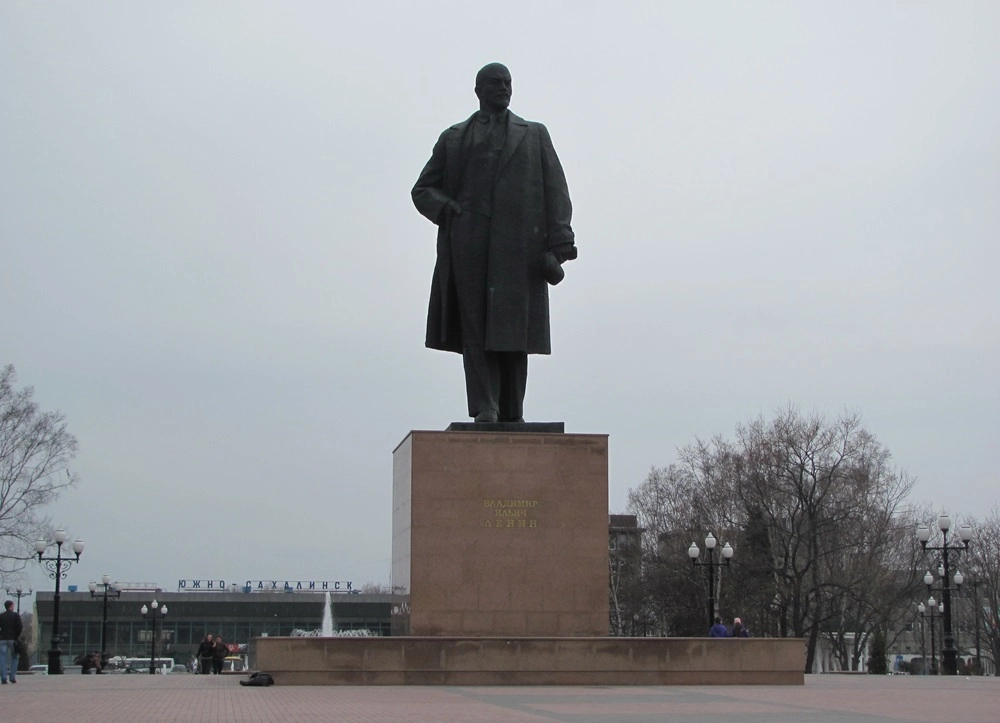 Южно-Сахалинск сильно вытянут с севера на юг, и проспект Мира, главная улица города, словно ось, пронизывает его на всём протяжении. Выйдя там, где на взгляд кажется «поцентрее», понимаем, что угадали — по Коммунистическому проспекту, перпендикулярному проспекту Мира, направляемся к железнодорожному вокзалу.