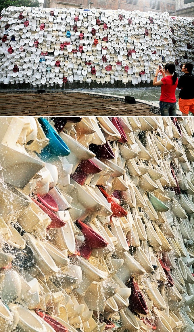 Одно из самых странных сооружений можно увидеть в центральной части провинции Гуандун в Китае — 10 000 унитазов, раковин и писсуаров покрывают стену на 100 метров в ширину и почти 5 метров в высоту. Фонтан-водопад два месяца создавался китайским художником Шу Юн и его командой для выставки на фестивале керамики и фарфора в 2009 году. Все унитазы периодически заполняются водой, превращаясь в каскадный водопад для развлечения зрителей.