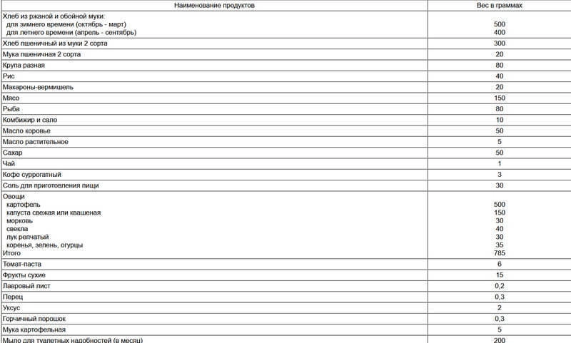 «Все продукты, как правило, должны быть подобраны с таким расчётом, чтобы их можно было употреблять в пищу без варки (сливочное масло, шпиг, сахар, шоколад, сухая колбаса, концентраты, печенье, белые сухари)».