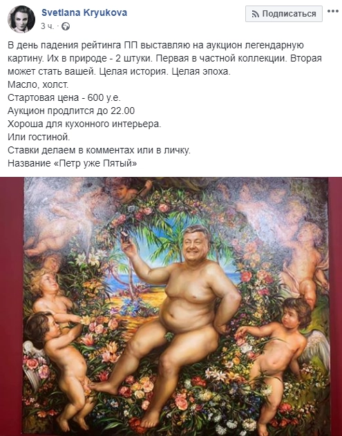 Пользователь Facebook Светлана Крюкова выставила на аукцион картину с изображением обнаженного экс-президента Украины Петра Порошенко.