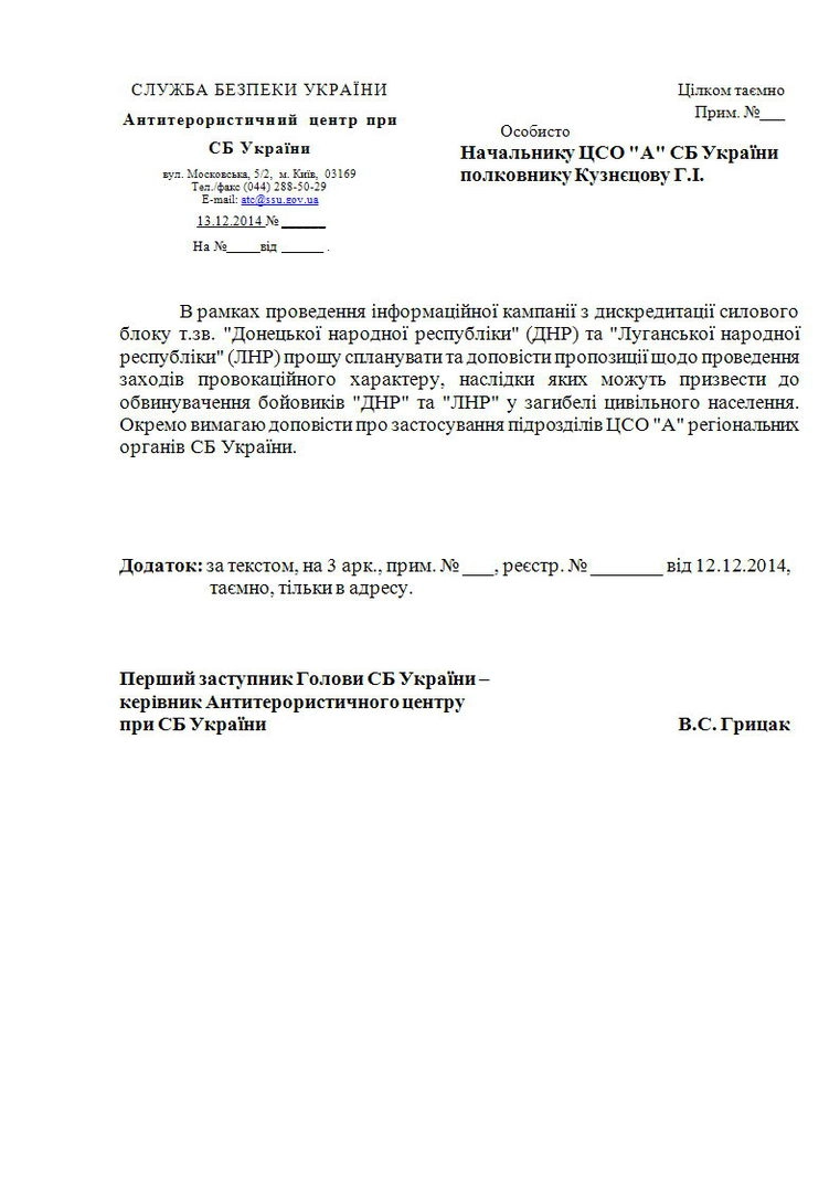 «Данное преступление … было осуществлено в рамках приказа Первого заместителя Главы СБУ — руководителя Антитеррористического центра при СБУ генерал-полковника Василия Сергеевича Грицака. Контролировать ход выполнения указанных выше мероприятий было поручено Начальнику ЦСО „А“ СБУ полковнику Геннадию Ивановичу Кузнецова», — говорится в сообщении, размещенном на сайте «Киберберкута».