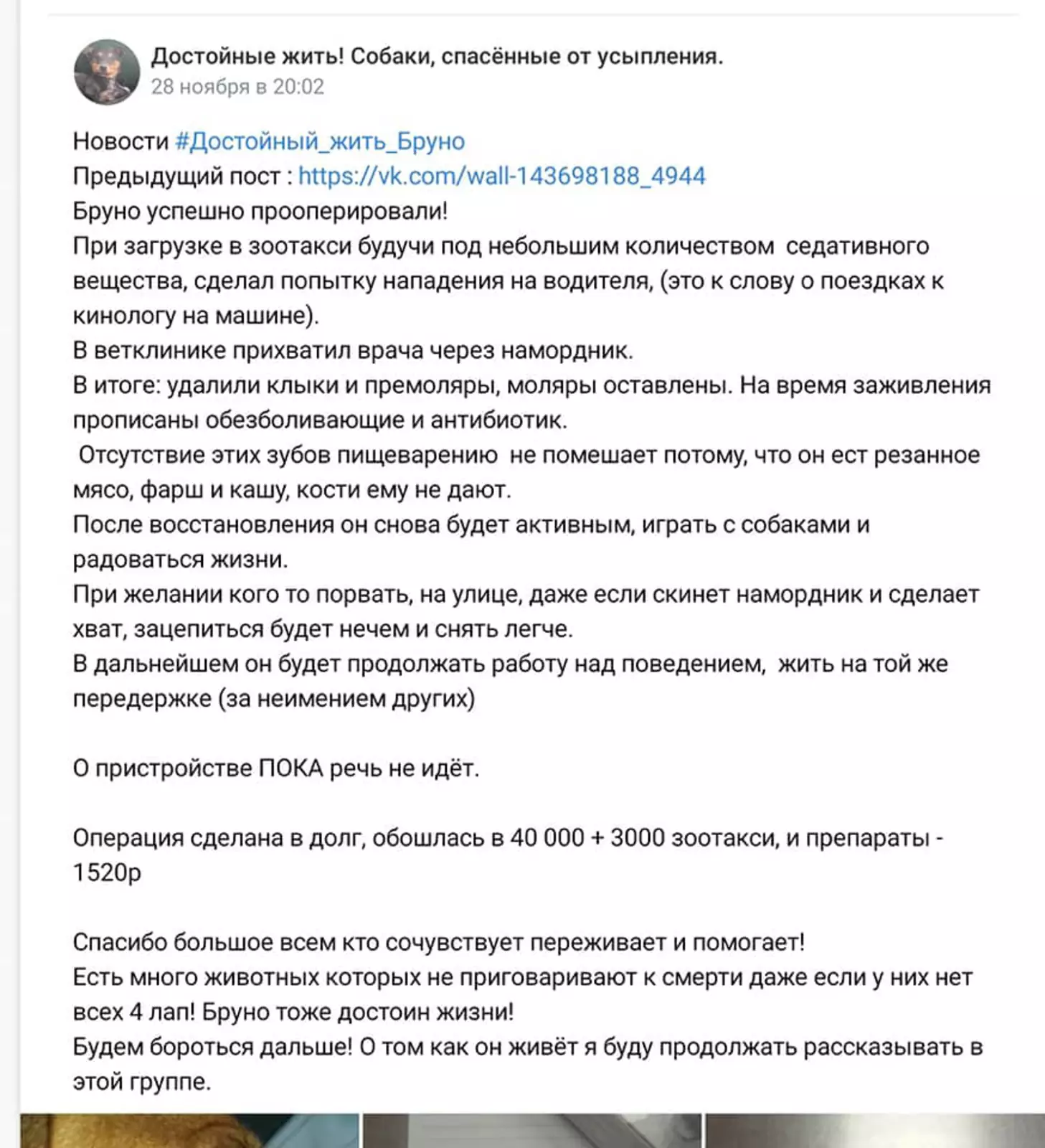 «Сначала он попытался сожрать отловщика, да так, что снимали удавкой. Потом покусал куратора. На прогулке, будучи в наморднике, чуть не убил таксу. Удержать и справиться с ним на прогулках можно с огромным трудом. Собака невоспитанная, взрослая, команд не знает, на поводке ходить не умеет, на улице истерит и пытается всех сожрать. К поводку и наморднику тоже не приучена», — рассказывает о псе специальный корреспондент Русфонда Светлана Машистова.В конце концов зоозащитники, взявшие на себя миссию по спасению Бруно, решили удалить ему часть зубов (клыки и премоляры), чтобы тем самым сделать его «безопасным» для окружающих.