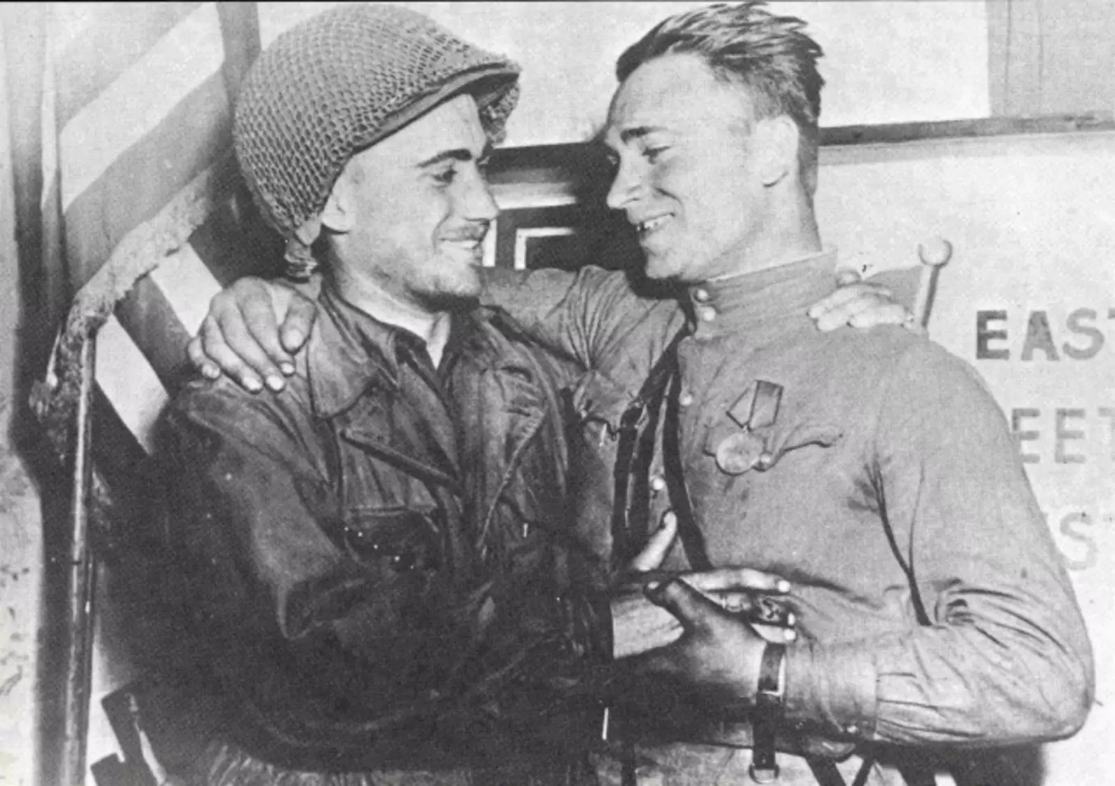 Солдат Пятого корпуса Армии США с советским солдатом в Чехословакии во время Второй мировой войны.
