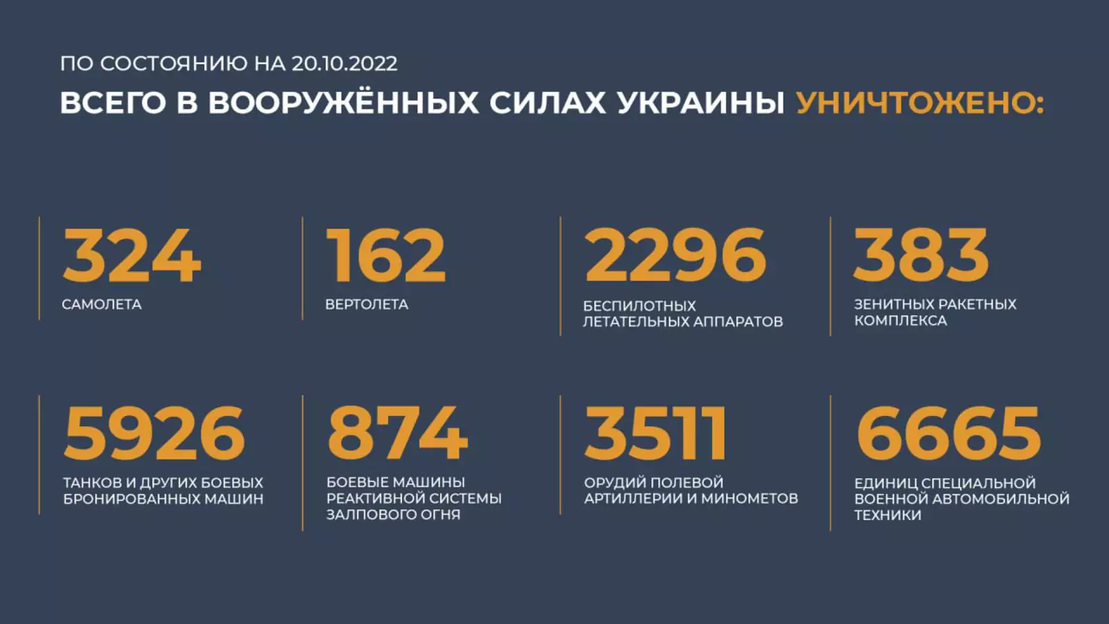 Оперативно-тактическая и армейская авиация, ракетные войска и артиллерия РФ поразили за минувшие сутки три пункта управления ВСУ, 72 артиллерийских подразделения, пять пунктов временной дислокации, четыре склада боеприпасов, хранилища топлива для военной техники, радиолокационную станцию контрбатарейной борьбы и радиолокационную станцию обнаружения маловысотных целей СТ-68УМ.