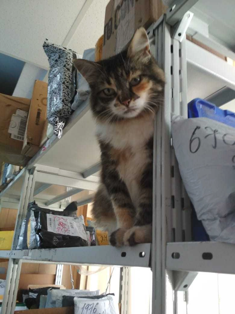 «А это наша красавица Маркиза, которая живёт в отделе доставки ОПС Калуга, Старый Торг-7. Маркиза очень любит почтовые ячейки и коробки с документацией!»