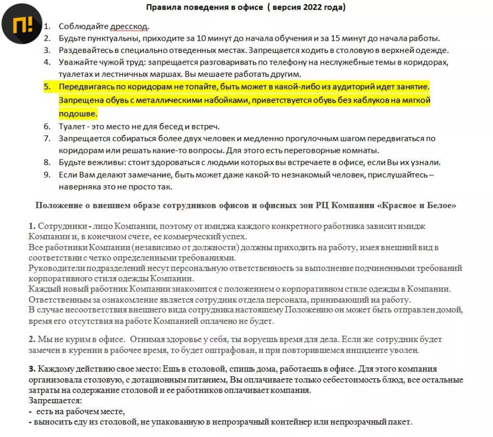 Из документа также следует, что сотрудникам «Красного и белого» нельзя общаться в туалетных комнатах, топать в коридорах, носить юбки, в которых «видно белье при наклоне вперед до угла 90 градусов», и сланцы.