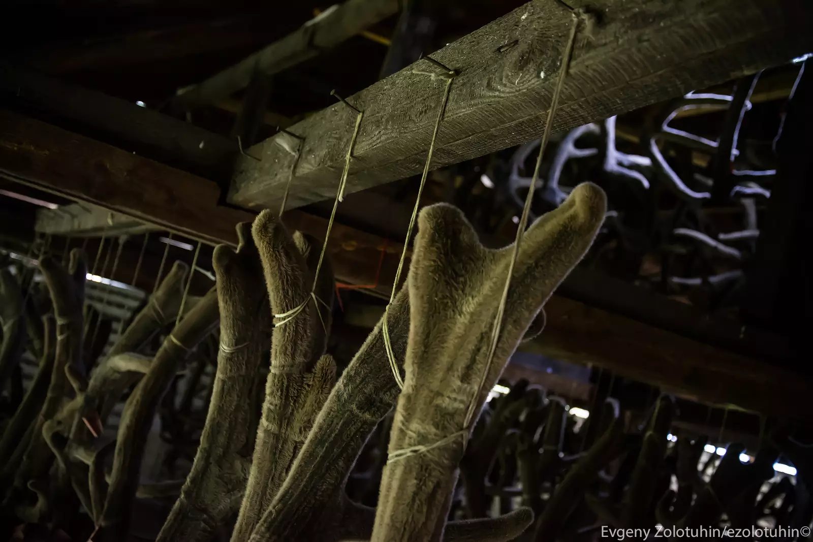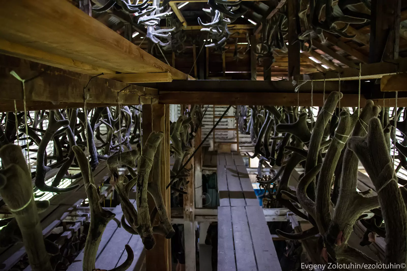 Последний сушильный этап проходит в ветровой — помещении, где панты подвергаются естественной сушке. Длится она около месяца. Первыми на сушку уходят самые большие панты, срезанные еще в мае, они могут пробыть в «ветровой» до двух месяцев. Но реализуются все панты вместе и в одно время, ближе к осени.