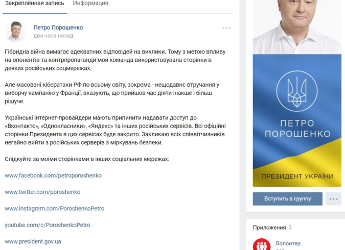 Более того, аккаунты самого Петра Порошенко в «Одноклассниках» и «ВКонтакте» живы-здоровы и даже публикуют новые записи. Последние — как раз на тему блокировки.