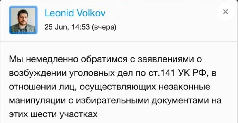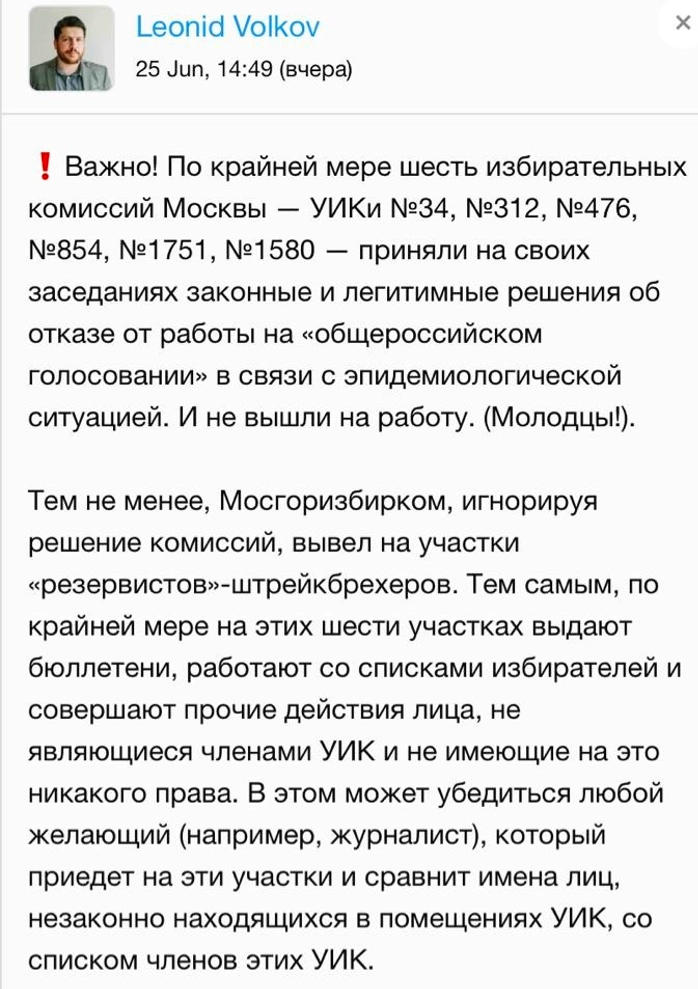 Как сообщает блог «Антипропаганда», Волков опубликовал сведения о том, что на шести столичных УИКах члены избирательной комиссии отказались работать в связи с эпидемиологической ситуацией. По версии соратника Навального, Мосгоризбирком заменил членов избиркомов — и они работали на участках не под своими именами.