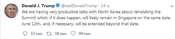 «Мы ведем очень продуктивные переговоры с Северной Кореей о восстановлении саммита, который, скорее всего, состоится в Сингапуре в тот же день, 12 июня, и при необходимости будет продлен», — сообщил он.