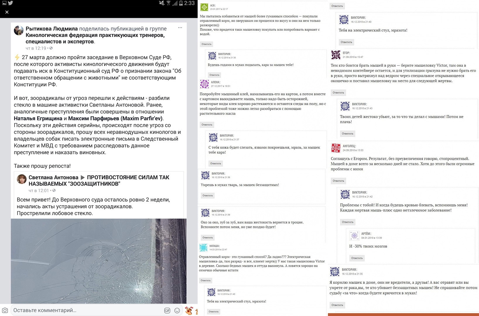 «Во время противостояния по закону о притравочных станциях разбили стекла в машине Наталье Егрищиной, потом то же самое они проделали с автомобилем Максима Парфирьева, когда мы выступали против создания списка опасных пород, — продолжает собеседница „Ридуса“. — Потом опять досталось Светлане Антоновой: чтобы она не поехала на заседание Верховного суда, ей прострелили лобовое стекло».