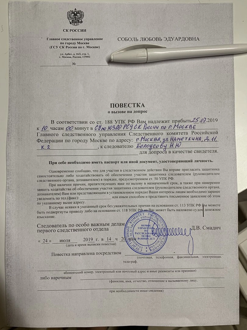 Пригнали целого подполковника из МВД по ЦАО вручить повестку. На 10 утра, в качестве свидетеля по уголовному делу, по какому именно — не указано, — написала Соболь в Twitter, добавив, что отправится в Мосгоризбирком, а не на допрос.