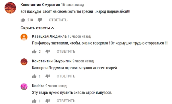 Комментарии с угрозами и оскорблениями в адрес Памфиловой и Горбунова можно с легкостью отыскать под любым агитационным роликом независимых кандидатов, а также к роликам с призывами участвовать в незаконном митинге в центре Москвы 27 июля.