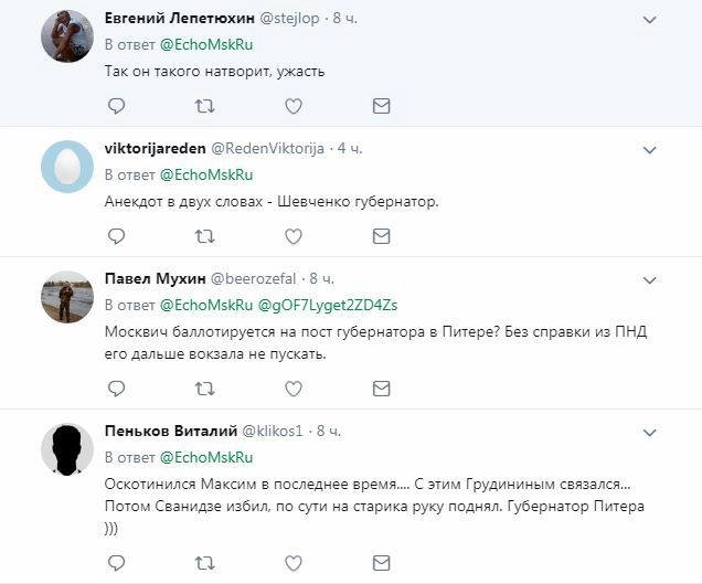 Пользователи соцсетей немедленно припомнили Максиму Шевченко его нецензурное высказывание в адрес жителей Петербурга. Сидя в студии радиостанции «Эхо Москвы», Шевченко возмутился тем, что петербуржцы выступают против идеи назвать мост через Дудергофский канал в честь главы Чечни Ахмата Кадырова, хотя допустили появление в городе памятной доски маршалу Маннергейму.