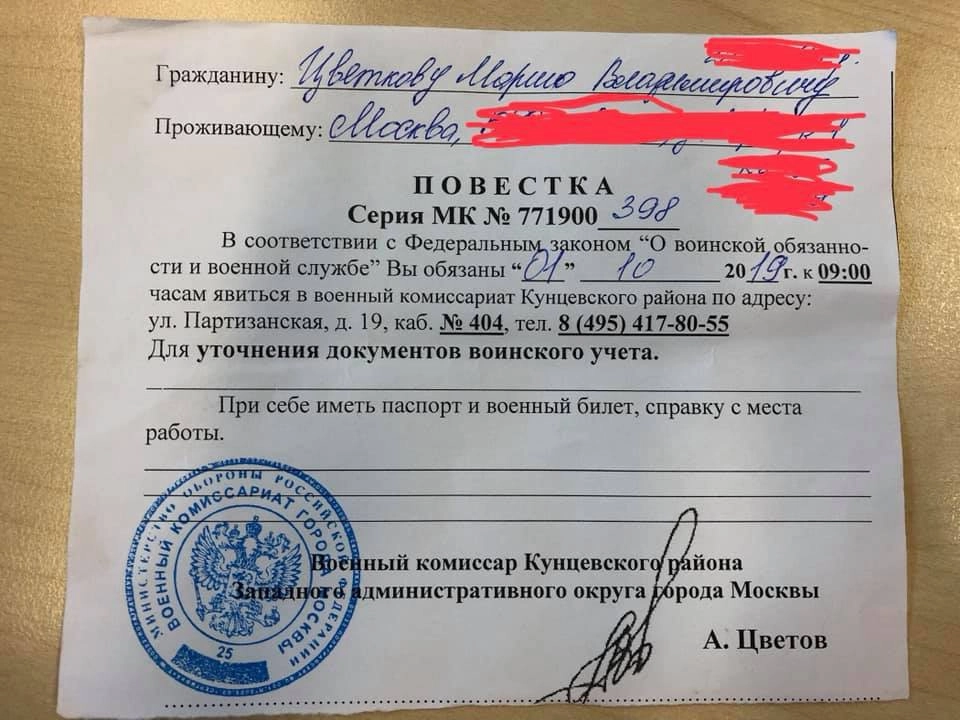 Журналистка Reuters Мария Цветкова после задержания на несанкционированном митинге 27 июля в Москве получила повестку в военный комиссариат, адресованную «Цветкову Марию Владимировичу». Этому гражданину приказано 1 октября явиться «для уточнения документов воинского учета».