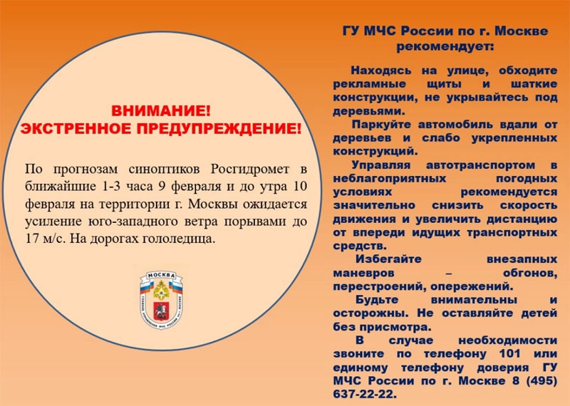 Синоптики прогнозируют 10 февраля небольшую облачность с прояснениями, преимущественно без осадков. Температура ночью в столице составит от -2 до 0°, по области — от -5 до 0°. Днем в Москве будет от 0 до 2°, В Подмосковье — от -3 до 2°. Ветер юго-западный. Его скорость — 7−12 метров в секунду, ночью местами с порывами до 12−17 метров в секунду. Днем скорость ветра будет достигать 15−20 метров в секунду. Местами гололедица.