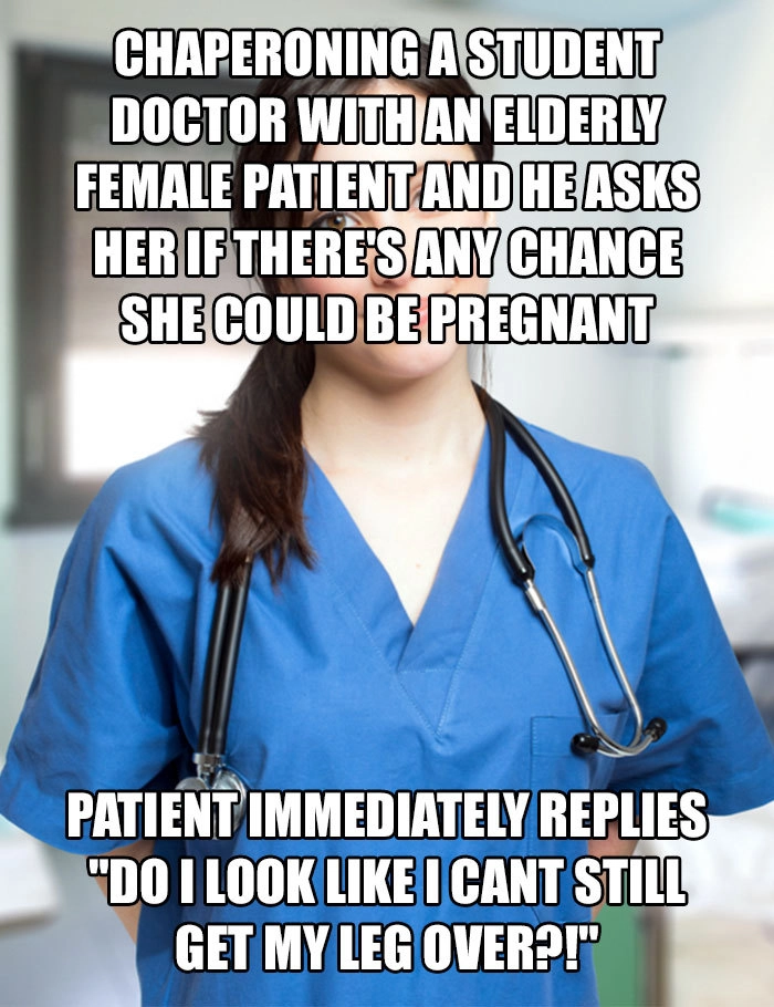 «Один интерн спросил свою пациентку, которой на вид было больше восьмидесяти лет, есть ли хоть малейший шанс, что она может быть беременна, на что женщина ответила: "А что, я выгляжу так, что больше не могу заниматься сексом?"».